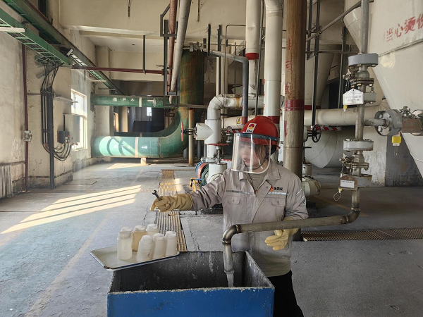 她們拎著貼好標(biāo)簽的取樣瓶,快步走向鹽硝廠房的各個取樣點,回來時,取樣瓶里裝著各色各樣的樣品,有的是晶瑩剔透的液體,在瓶中輕輕晃動,泛起細(xì)碎的漣漪;有的是白色的晶體顆粒,隨著腳步的顛簸,發(fā)出“沙沙”的輕響;還有的是粘稠的漿液,掛在瓶壁上,緩緩滑落。將樣品放置在滴定檢測區(qū)的那一刻,瓶身與臺面碰撞,發(fā)出“!钡囊宦暣囗懀袷菫榻酉聛淼幕灩ぷ,敲響了開場的鼓點。