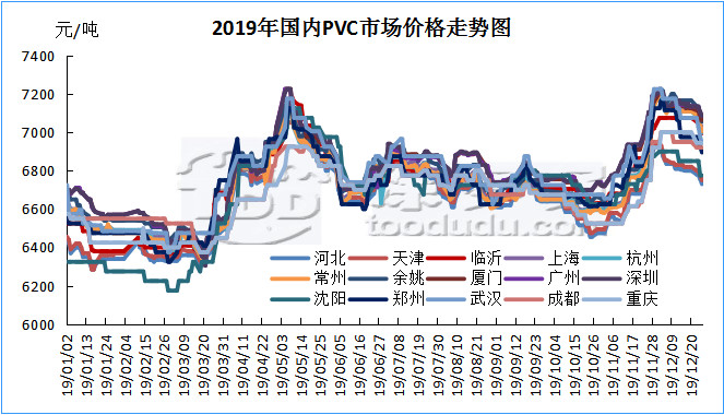 2019年中國國內PVC市場仍舊是價格高位整理的一年,全年價格波動區(qū)間以華東主流為例在6440-7225元/噸之間,高低價差785元,從走勢圖以及月均價走勢可以看出,2019全年經歷兩撥較大幅度的推漲,其中第一季度1-3月份市場較為低迷,處于低谷整理期,4月份開始市場價格開始緩慢上漲,經歷不斷的上漲價格在5月中旬開始達到年內第一次高點,價格達到高點后,需方承受能力有限,價格開始下行,下行至6月中下旬后,市場開始進入緩慢的整理期,長達4個月,6月中下旬-10月中旬,價格一直處于小幅震蕩整理中,供需雙方的博弈一度令PVC整體產業(yè)鏈進入迷茫期,多數行業(yè)內人士甚至認為PVC產品的下跌大周期開始來臨,我們回顧下往年的PVC行情,其價格在15年5月初達到最低點后內蒙出廠4350元/噸含稅,價格在歷史低點后開始不斷反彈,在經歷了16-18年的整理后,在19年中國國內PVC市場仍占據高點,四年間PVC生產企業(yè)賺的盆滿缽滿。但下游制品企業(yè)卻苦不堪言,并且自18年國家稅控改革以來,次終端貿易商對稅票逐漸失去控制,導致次終端利潤不斷下滑,規(guī)范的市場導致票貨分離減少。而在整個PVC產業(yè)鏈中,生產企業(yè)占據越來越多的話語權,從而導致了雖然我們看到在迷茫期過后,第四季度國內PVC市場仍舊迎來年底第二次大漲,此次上漲把PVC價格推上了真正的年底高點。第四季度的上漲導火線為內蒙企業(yè)裝置出現意外事件停產,市場炒作聲漸起,價格開始上漲,而隨后的11-12月份,在期貨的帶動下,價格不斷被推上新高。12月中旬需方面對如此高的價格開始產生抵觸心理。而此時的年度備貨來臨,市場不但沒有復漲反而開始進入蕭條期,價格開始下滑。