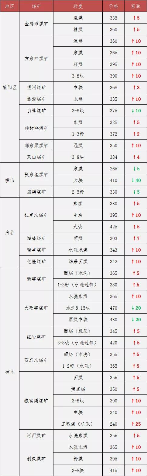 榆林煤價繼續(xù)漲:18家煤礦上調價格5-10元/噸 周末至今,榆林18家煤礦又上調價格。據榆林煤炭交易中心數據顯示,截止目前,榆陽區(qū)(6000k 0.6S)動力煤均價為357元/噸,環(huán)比上漲6元/噸;神木(5800k 0.4S)動力煤均價為339元/噸,環(huán)比上漲5元/噸;府谷(5500K 0.4S)動力煤均價為322元/噸,環(huán)比上漲7元/噸。 最新調價煤礦: